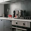 There is an open kitchen, equipped with oven and microwave, various kitchen utensils, dishwasher, coffee machine and fridge.