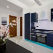 The kitchen is fully equipped with modern appliances and an induction hob. The furnishings are minimalist, with glossy doors and clean lines, creating a modern and functional environment.